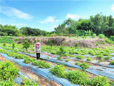记者了解到,该基地是地豆镇狮岭村去年在佛山市驻镇帮扶工作队的帮助下,联合德森生物科技(肇庆)有限公司(以下简称“德森公司”)新引进的项目,计划打造千亩中药种植园区。粉防己、大百部、蔓性千斤拔……狮岭村连片400多亩土地上多种南药正蓬勃生长,这里的撂荒地被再利用,山林地也被盘活,周边闲余的村民也来务农,乡村产业发展、农民增收致富的幸福画卷正在此徐徐展开。
