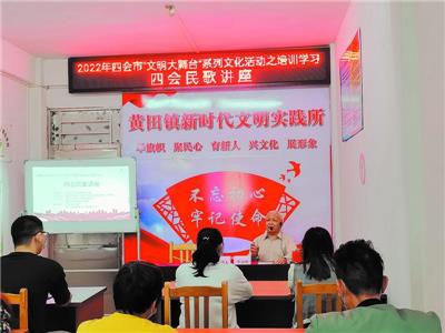 10月27日,为丰富人民群众文化生活,提升基层文化艺术水平,宣传四会文化正能量,由四会市文化广电旅游体育局、四会市黄田镇人民政府主办、四会市文化馆、黄田镇文广旅体服务中心协办的2022年四会市“文明大舞台”系列文化活动之培训学习——四会民歌讲座在四会市文化馆黄田镇分馆举行。本次活动特邀广东省级非物质文化遗产项目(四会民歌)代表性传承人李重明老师展开现场教学。