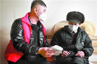 1月7日,在海南省文昌市铺前镇地太村,村干部向高龄老人发放防疫“健康包”,并介绍防疫物品使用方法。
