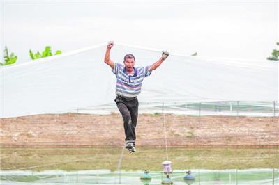 给一口四五亩的虾塘覆膜,需要二三十名村民合力劳作,一次完成。只见三四个精壮小伙走上虾塘正上方的钢丝,双手托举起薄膜,像纤夫一样使劲向前拽,一个小伙不远不近跟在下方把膜顶起走,妇女和年纪稍大的平均分布在两侧,跟着小伙子的节奏一边拉着膜走,一边双手用力抖动薄膜。随着师傅们此起彼伏的吆喝声,大家步调一致,脚步横跨过虾塘,雪白的薄膜也顺利盖上,十分钟左右可以完成一口塘的覆膜。