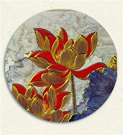 莲花在佛教中象征“极乐净土”与“重生”的生命意义,在世俗中,荷花“出淤泥而不染”的品格,尤为文人墨客所推崇。何超以铜板为载体,以刀代笔,综合运用多种刀法手工雕刻,再经表面着色与镀金,追摹原画的笔墨、色彩与神韵。