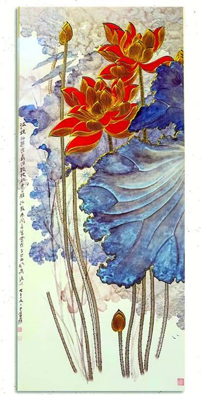 以金属雕刻的形式表现张大千的工笔重彩画《金线荷花》是作者大胆的探索,其意在尝试材质与题材的融合共生,借此《映日荷花》追求金属雕刻画独到的审美品位与欣赏价值。此作,墨绿色的荷叶深浅变化,层次丰富,墨韵缤纷;两朵舒瓣怒放的荷花,婀娜多姿,其嫣红色明快、热烈、活泼,具有一种活力与现代感……整个画面颇具“接天莲叶无穷碧,映日荷花别样红”的诗情画意。