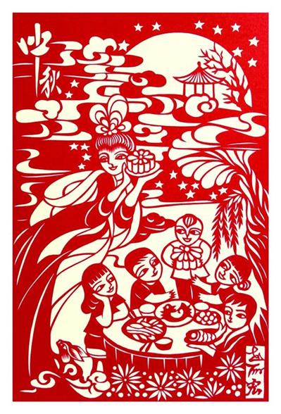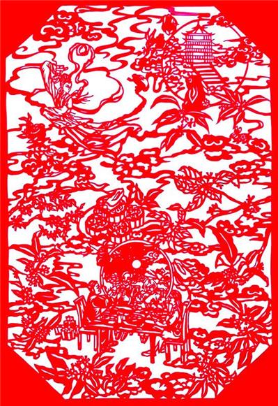 作品简介:作品下方描绘了中秋佳节祖孙三代六口人,在自家庭院喝菊花酒、吃月饼,说说笑笑赏月的情节,整个温暖的家庭氛围周围环绕着盛开的桂花。在桂枝的穿插中展示了神话传说故事中的月兔、嫦娥奔月、广寒宫等等。整个作品体现了在这花好月圆之夜一家人和谐、美好、团圆景象。