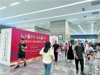 在肇庆市博物馆一楼,《“礼赞新中国 奋进新时代”——庆祝中华人民共和国成立75周年》书画展,同样吸引众多游客前来打卡。