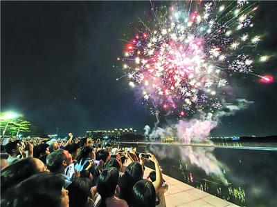 砚阳湖非遗打铁花、水上火壶、水上飞人烟花表演现场。 西江日报记者 朱梦丹 摄