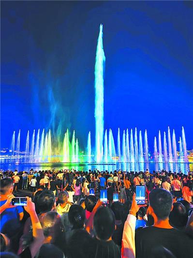 国庆期间恢复播放的牌坊音乐喷泉为市民游客带来了一场视听盛宴。 西江日报记者 曹笑 摄