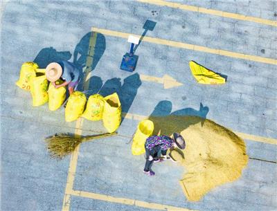 在高要区回龙镇广袤的田野上,收割机轰鸣,农民忙碌运送稻谷的身影随处可见,村头巷尾的晒场上,到处铺晒着金黄的稻谷,又是一个丰收年。图为农民抓紧好天时在晾晒稻谷。