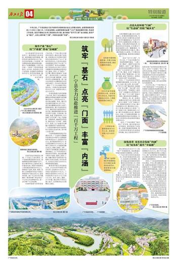 同时,广宁县坚持科学制定典型镇村建设蓝图,全力打造一批“点上出品、线上出彩、面上出新”的“百千万工程”精品项目,高质量打造“红之源”“绿之韵”乡村振兴示范带、“诗画绥江·绿美竹乡”文旅融合示范带及学习推广浙江“千万工程”经验示范区,推动和美乡村新蝶变。