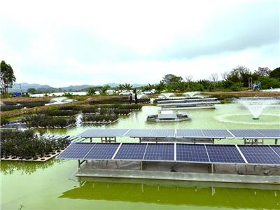 技术人员根据各地区养殖塘尾水特点,每100亩至150亩养殖塘设置一套悬浮式高效生化处理系统,系统配套高效生化处理设备、光伏智能动力系统、曝气系统和智慧云控制系统,采用全光伏供电,降低运行费用。