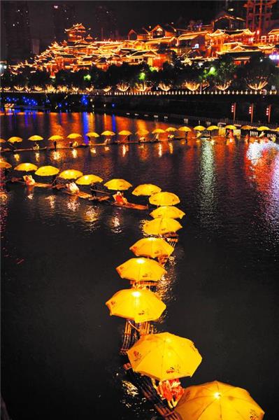 当日,在湖北省恩施土家族苗族自治州宣恩县贡水河上,一场“贡水游龙”迎新春活动吸引不少市民游客参与体验。“贡水游龙”由数十条竹筏作“龙身”,辅以灯光、音乐,人们可以在贡水河上“乘龙”观赏璀璨夜景,欢乐迎新春。 新华社