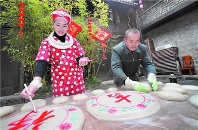 1月15日,在黄平县旧州古镇,村民给香糯糍粑印花上色。