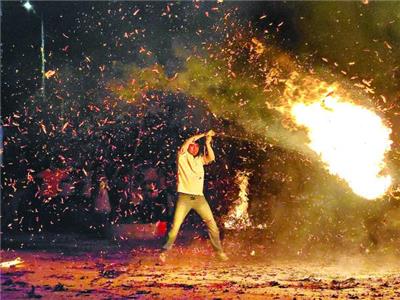 昨晚,端州区黄岗街道白石村上演惊险刺激的中秋传统非遗民俗活动“甩火球”。 西江日报记者 曹笑 摄