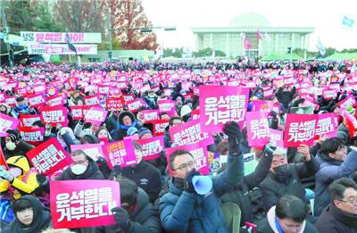 ▲12月7日,在位于韩国首尔的国会附近,韩国民众集会要求弹劾总统尹锡悦。 新华社