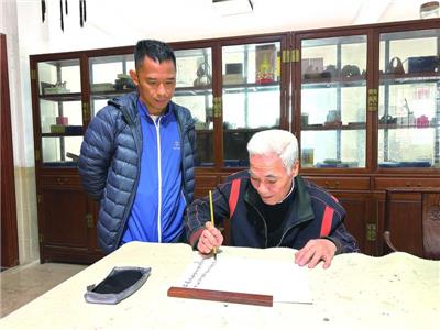 端砚民谣第十二代传人程均堂(坐)向儿子程海锋传授端砚民谣歌词。西江日报记者 杨永新 摄