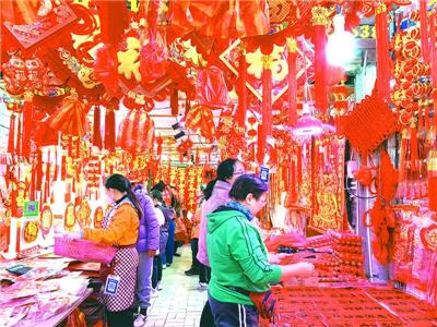 在批发市场旁边的沿街商铺,众多摊档摆满了各式散装糖果、干果等休闲食品,也有糖冬瓜、糖莲藕、米饼等传统零食,是不少人记忆中的年味。不少临街铺面门面上悬挂着喜庆的红灯笼和新年饰品,融入“蛇”元素的春联窗花、喜庆的福字挂饰,挂满了店铺的每一个角落,寄托着人们对新年的美好祝福,吸引着顾客们在摊位前驻足停留,浓浓的节日氛围让消费热度持续上升。