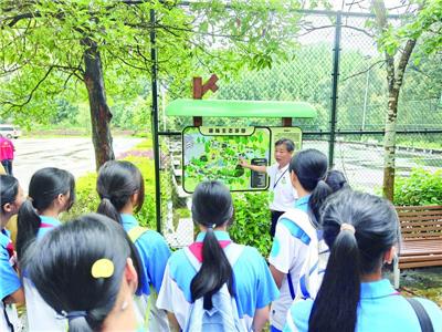 三岳省级自然保护区是省、市的科普教育基地,谭鹰在向学生进行动植物科普。 西江日报通讯员供图
