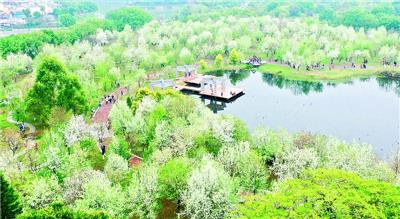 ▼肇庆市牌坊公园连片的梨花盛开,吸引众多市民、游客前来观赏、游玩。西江日报记者 刘春林 摄