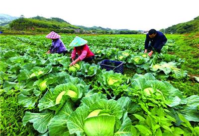 仓丰村村民在稻蔬轮作基地收割包菜。