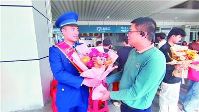 端州区接站工作组的工作人员为退役士兵送上鲜花。市退役军人事务局供图