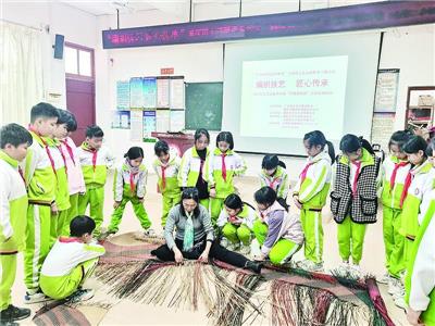 活动现场,省级非物质文化遗产传承人何冠醒用生动的案例,向学生们讲授了金渡花席编织技艺的基础知识。她详细介绍了花席的图案、纹路、编织方法及技巧,并现场示范。学生们在何老师的指导下,采用纸条练习编织,很快熟练掌握了“十字纹”等简单的花席纹路编织技巧。他们一边编织一边交流心得,现场充满了欢声笑语。