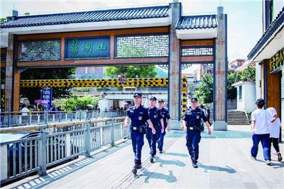 在热闹非凡的端州区星湖国际商圈,市民经常可以看到“星湖同舟”志愿警察的身影。端州区于2020年成立“星湖同舟”志愿警察队伍。队伍成立以来,队员穿梭于社区大街小巷,开展治安巡逻、安全隐患排查、法治宣教等工作,为平安端州建设作出积极贡献。