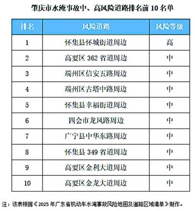 广东省水淹事故中、高风险道路合计907条。其中,我市共有水淹高风险道路1条,中风险道路14条。排名前10路段为怀集县怀城街道周边、高要区362省道周边、端州区信安五路周边、端州区古塔中路周边、怀集县幸福街道周边、四会市龙凤路周边、广宁县中华东路周边、怀集县349省道周边、高要区金利大道周边以及高要区金龙大道周边。