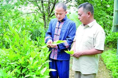 涂沛常(左)与茶农交流种茶心得。 西江日报通讯员 何丽玲 摄