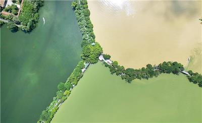 前段时间,受强降雨影响,北岭山突发山洪,部分洪水流入星湖。其中,仙女湖和青莲湖受影响较大,中心湖次之。因里湖独立成湖,有调节水量设施,水质保持清澈。因此,短时间内,星湖形成绿、黄、青“三色湖”这一奇特景象。目前,星湖正在进行排水调节,过后将恢复“一清一色”。